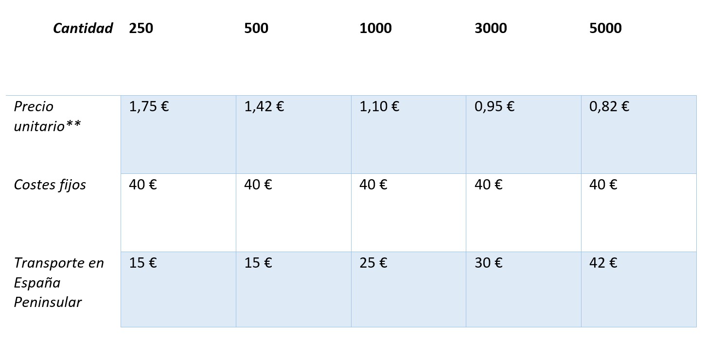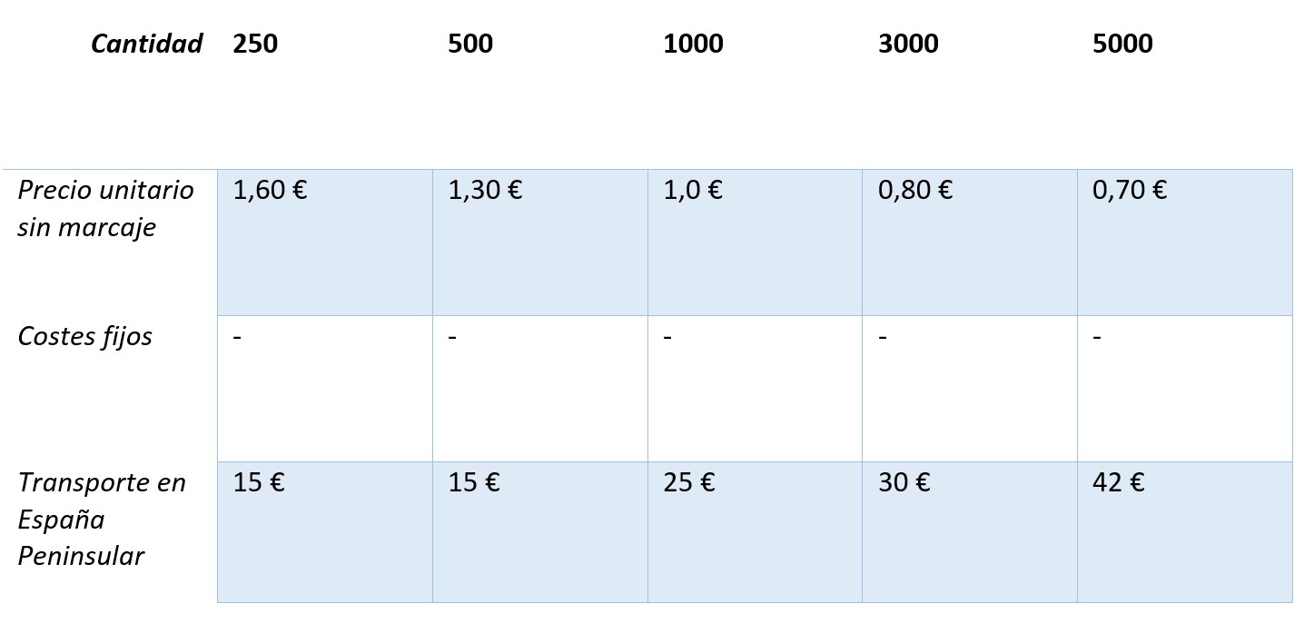 - Si el pedido es superior al 1000 €, el cliente tiene que pagar el 50% antes de la producción y el otro 50% antes de la expedición.